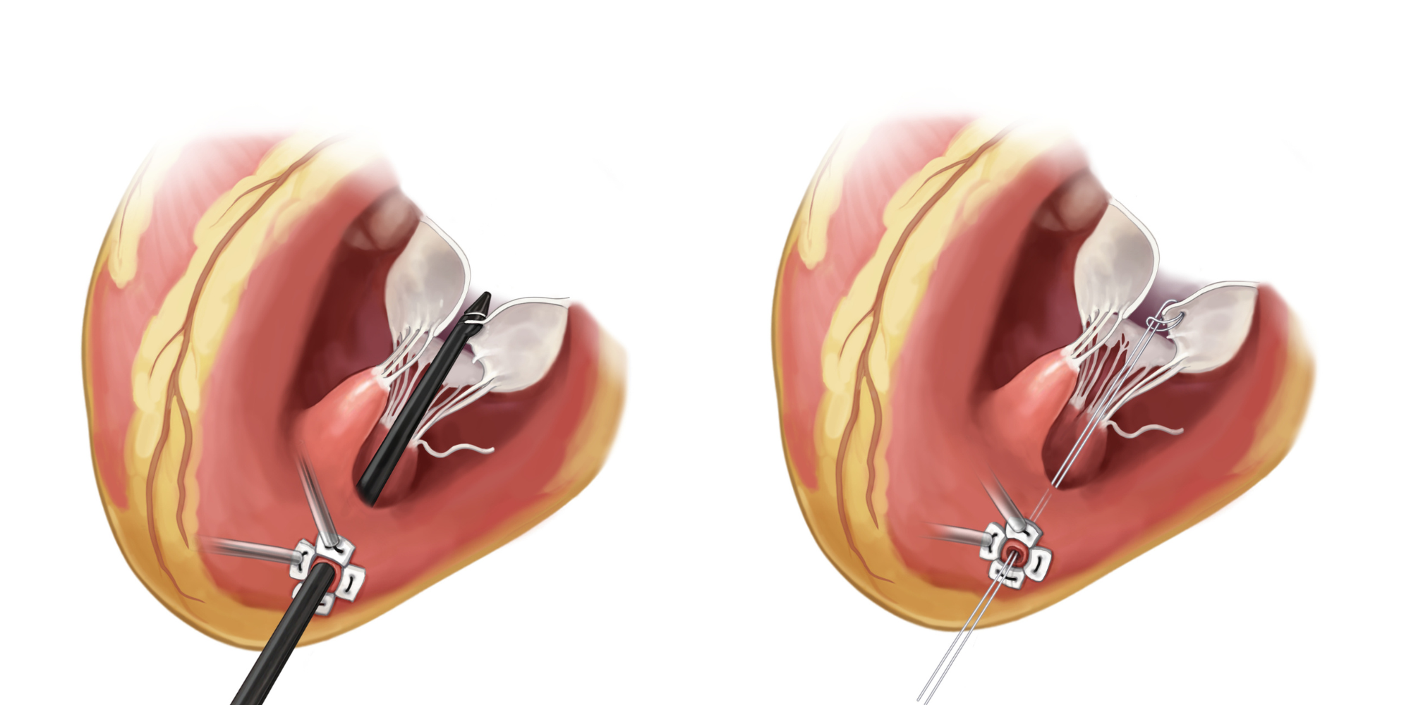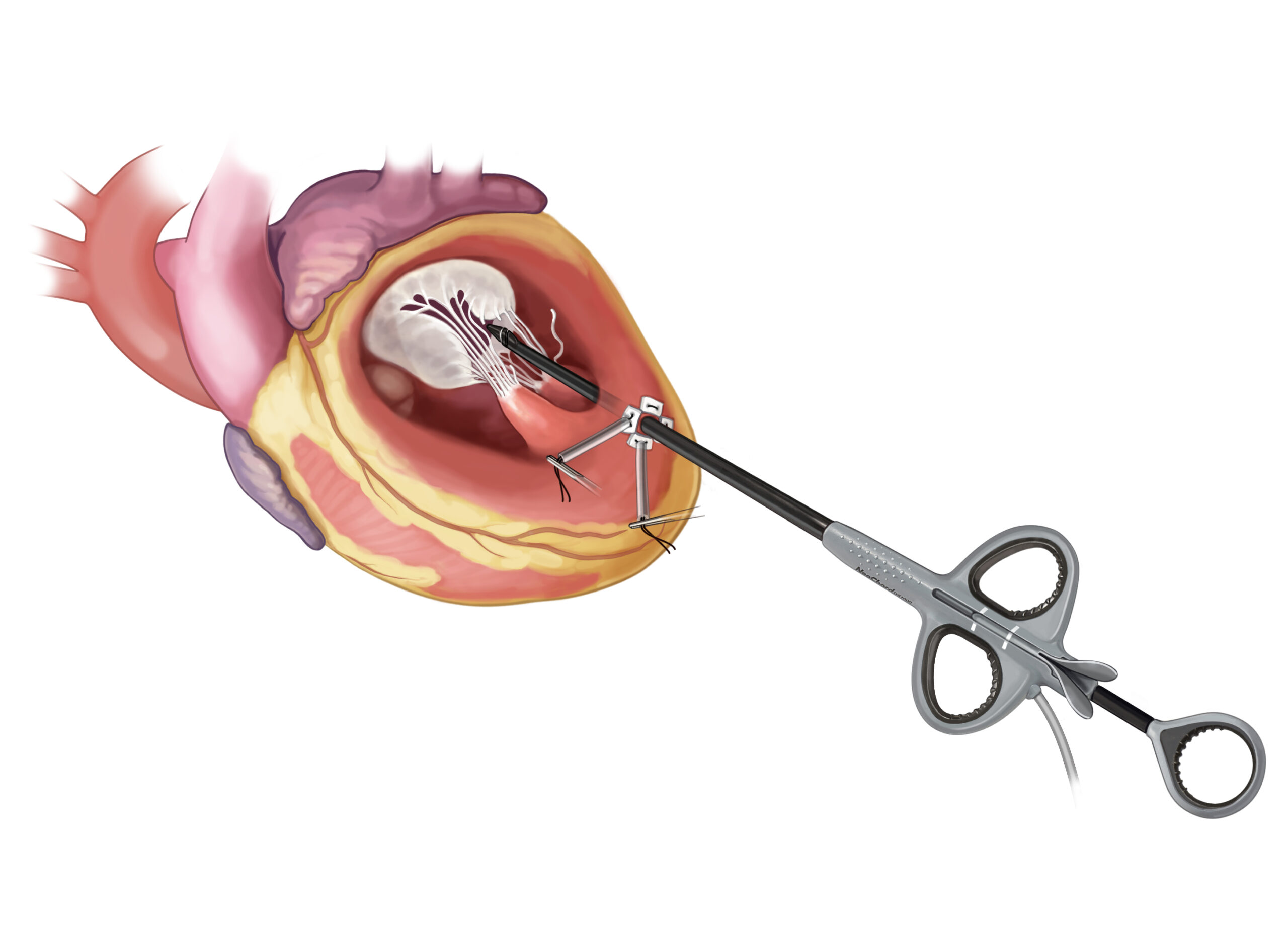 Using the NeoChord system, mitral valve repair is performed through a small incision between the ribs (thoracotomy).