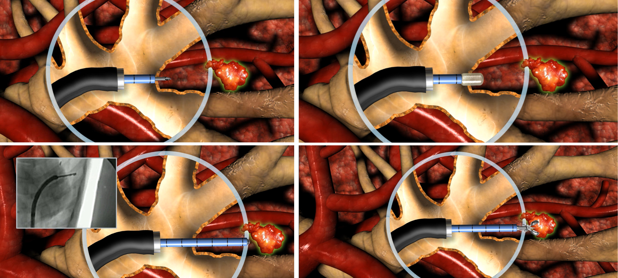The Archimedes system in action. After a non-vascular path to the pulmonary nodule has been mapped out by the advanced software, the Archimedes Sheath is advanced through the lung tissue via the airways to collect a biopsy sample.