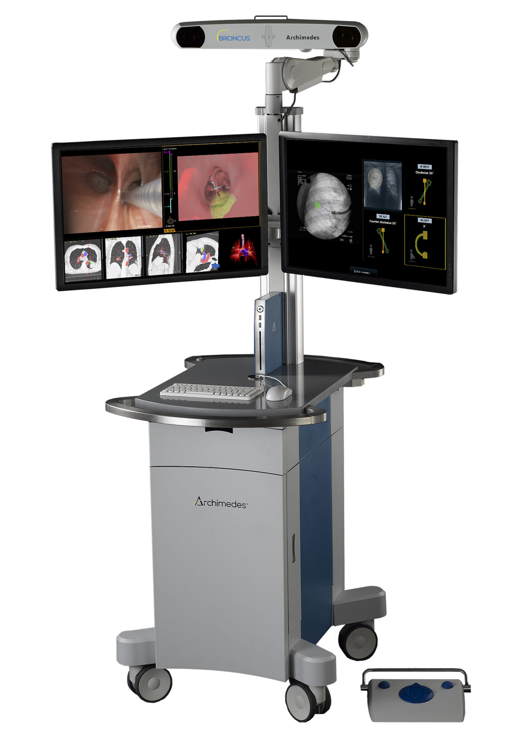 Thankfully, a new minimally invasive bronchoscopic technique is now available which enables safe access to pulmonary nodules even when they are beyond the limits of the airways. The innovative Archimedes® Virtual Navigation System integrates CT, pattern recognition software and fused fluoroscopy to provide three-dimensional, real-time airway Guided Transbronchial Needle Aspiration (TBNA) and Bronchoscopic Trans-Parenchymal Nodule Access (BTPNA) to collect biopsy samples with accuracy.