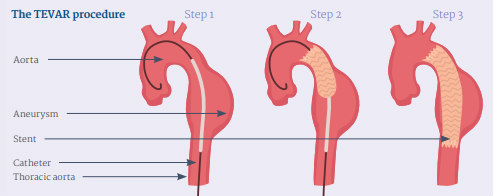 TEVAR is a technique Professor Nienaber helped pioneer over 20 years ago. It only requires a minor incision in the groin to access the area affected in the thoracic aorta, to treat an aneurysm or aortic dissection.